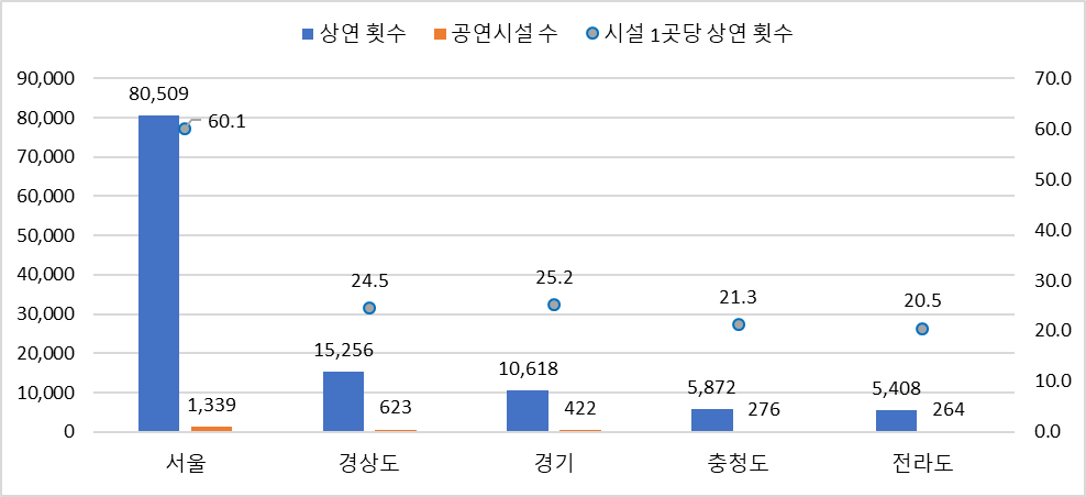 공연장 숫자만 봐서는 잘 모르겠다면, 공연시설 한 곳당 실제로 몇 번 공연이 열렸는지를 계산해보는 것도 좋은 방법이에요.